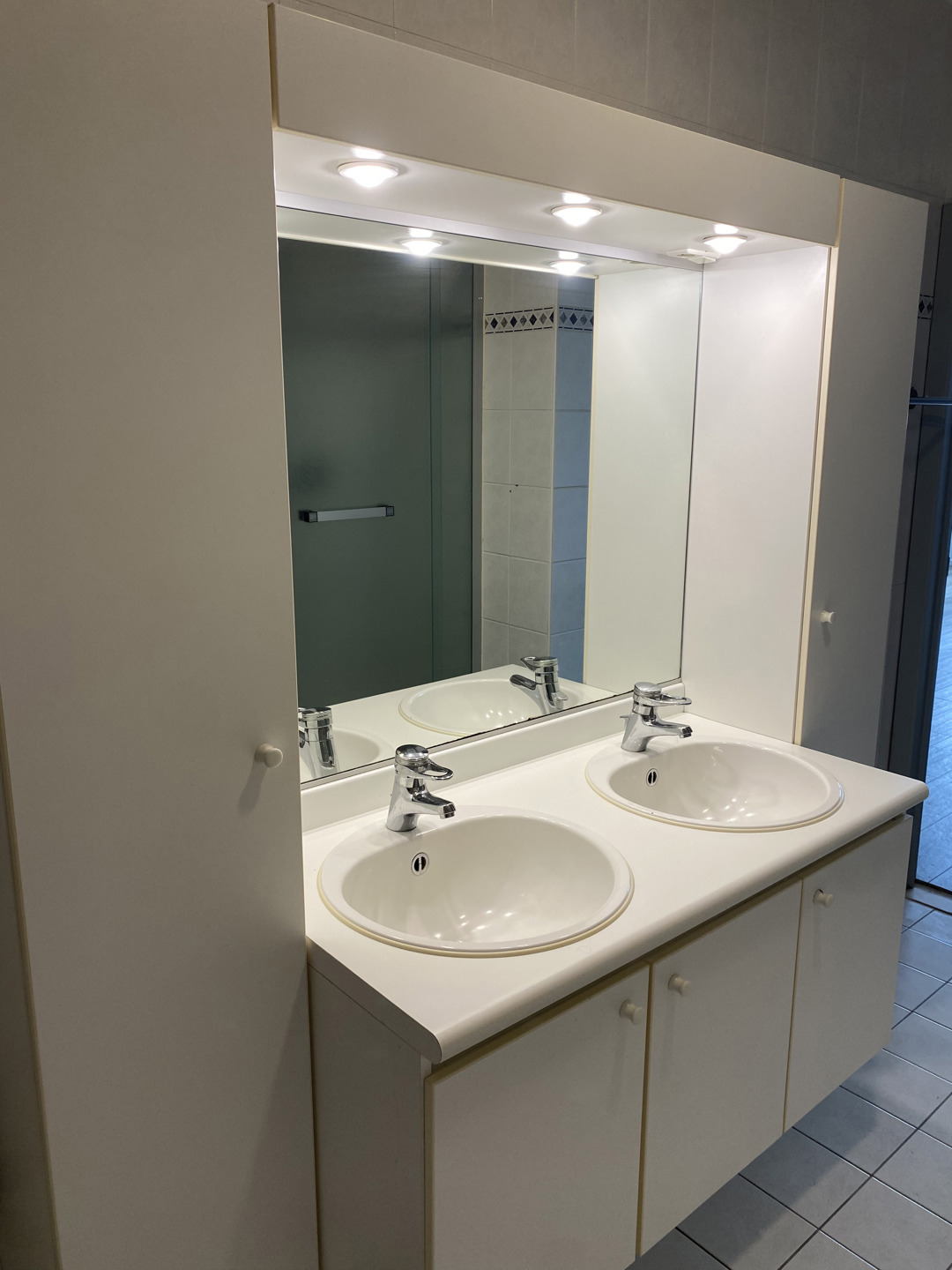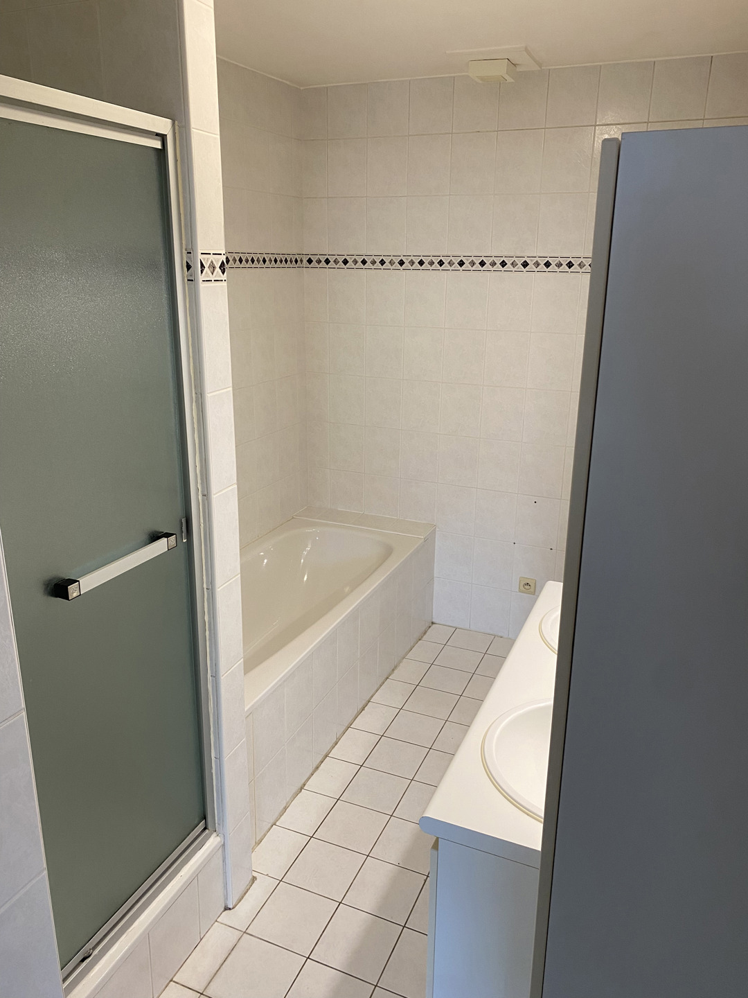 Une salle de bains 3,50x2,10 avec double lavabo, armoires, baignoire, wc et douche.