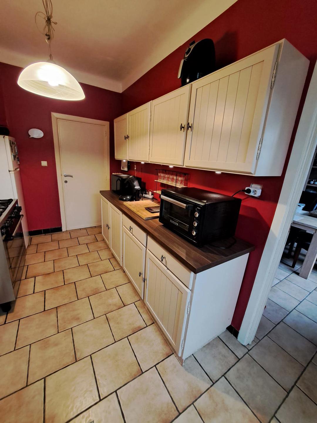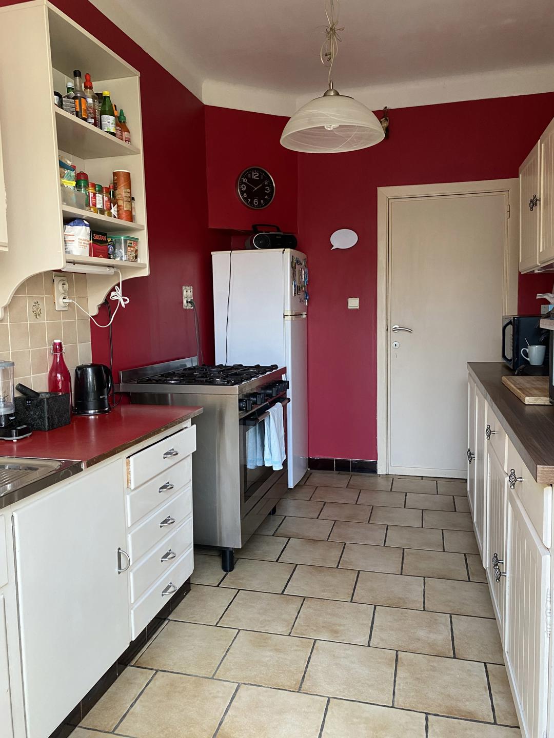 Een keuken van 4.00x2.20 uitgerust met gaskookplaten, koelkast, dubbele spoelbak en meubilair